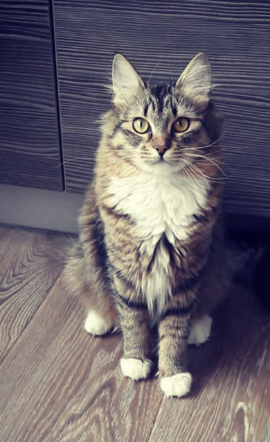 Пушистая,окрас лесной(полосатая)с белыми лапками и грудкой
